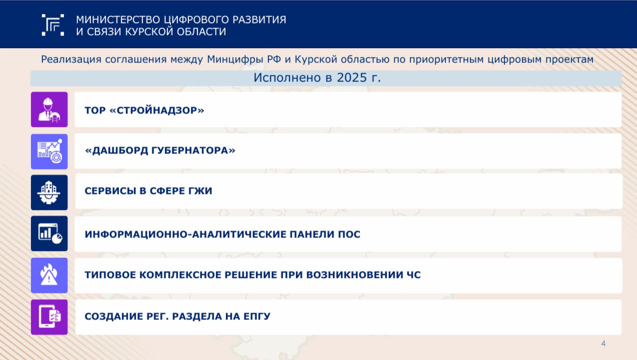 В соответствии с соглашением о реализации приоритетных цифровых проектов между Курской областью и Минцифры России в 2025 году успешно реализованы шесть цифровых проектов.