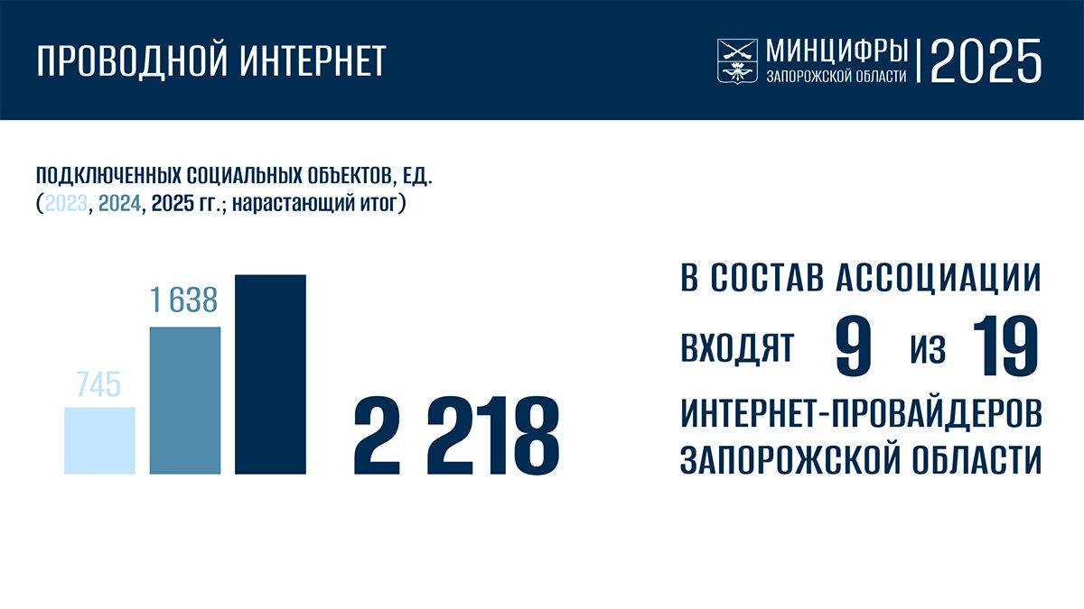 Развитием инфраструктуры проводного Интернета в Запорожской области занимается 19 компаний, девять из которых объединились в Ассоциацию провайдеров для координации работы, особенно в отдалённых районах. Наша ключевая задача – подключение социально значимых объектов по программе социально-экономического развития новых регионов, реализуемой совместно с Минцифры России.