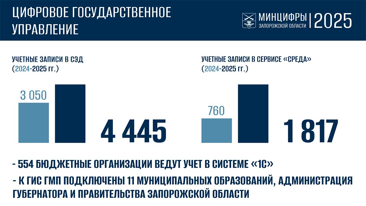 В 2025 году цифровизация госуправления в Запорожской области вышла на новый уровень. Работа ведётся по всем фронтам. Для органов власти мы внедрили целый комплекс решений. Основу составляет система электронного документооборота, которая объединила уже 371 организацию и 4445 пользователей.