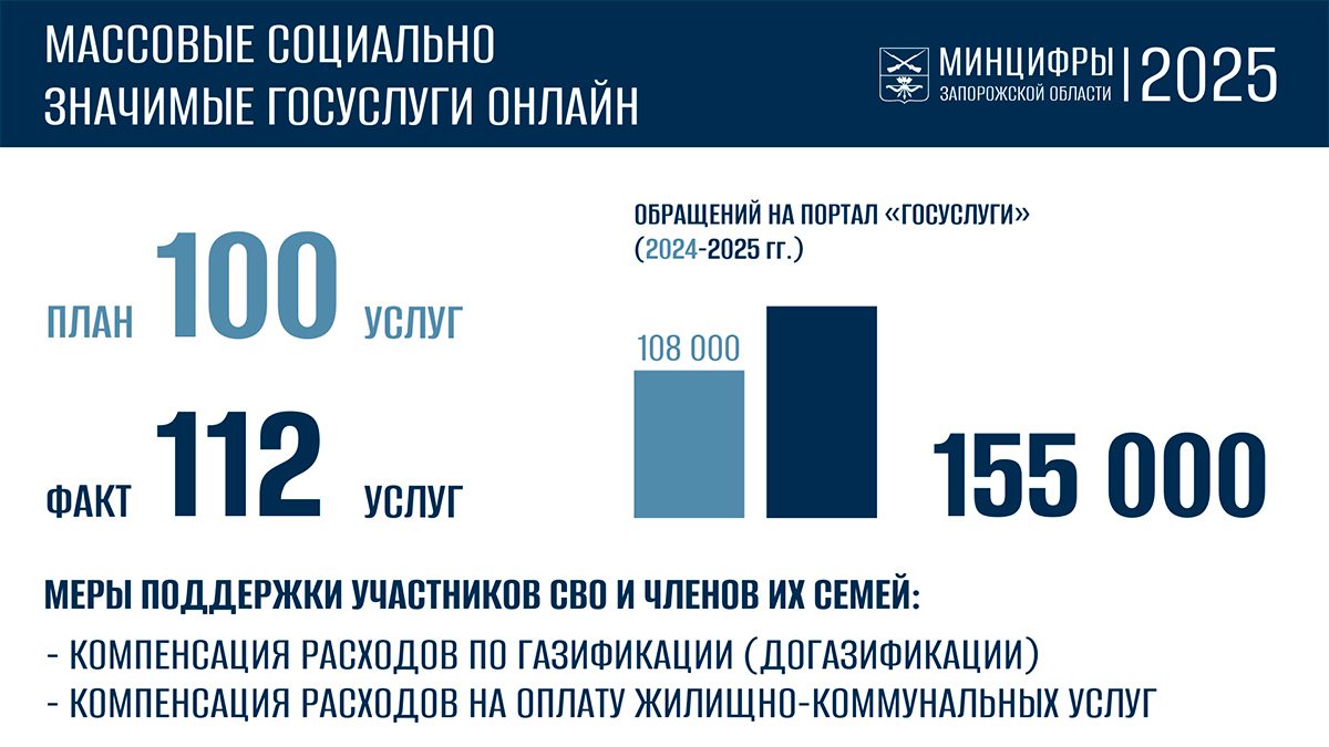 Но главный фокус – это удобство для жителей. Через ЕПГУ в 2025 году подано свыше 155 тысяч заявлений – это в 1,5 раза больше, чем в прошлом году. Сегодня в Запорожской области в электронном виде оказывается уже 112 федеральных и региональных услуг. Самая популярная из них – получение сведений о назначенных выплатах и льготах.
