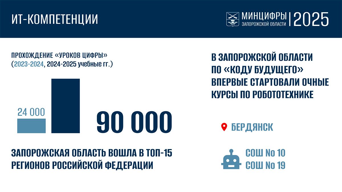 Кадры мы растим со школы. В рамках всероссийского проекта «Урок цифры» в 2024-2025 учебном году занятия прошли более 90 тысяч раз – это почти в четыре раза больше, чем годом ранее. 70 запорожских школьников успешно завершили спецкурс по созданию Telegram-ботов на Python с элементами искусственного интеллекта.