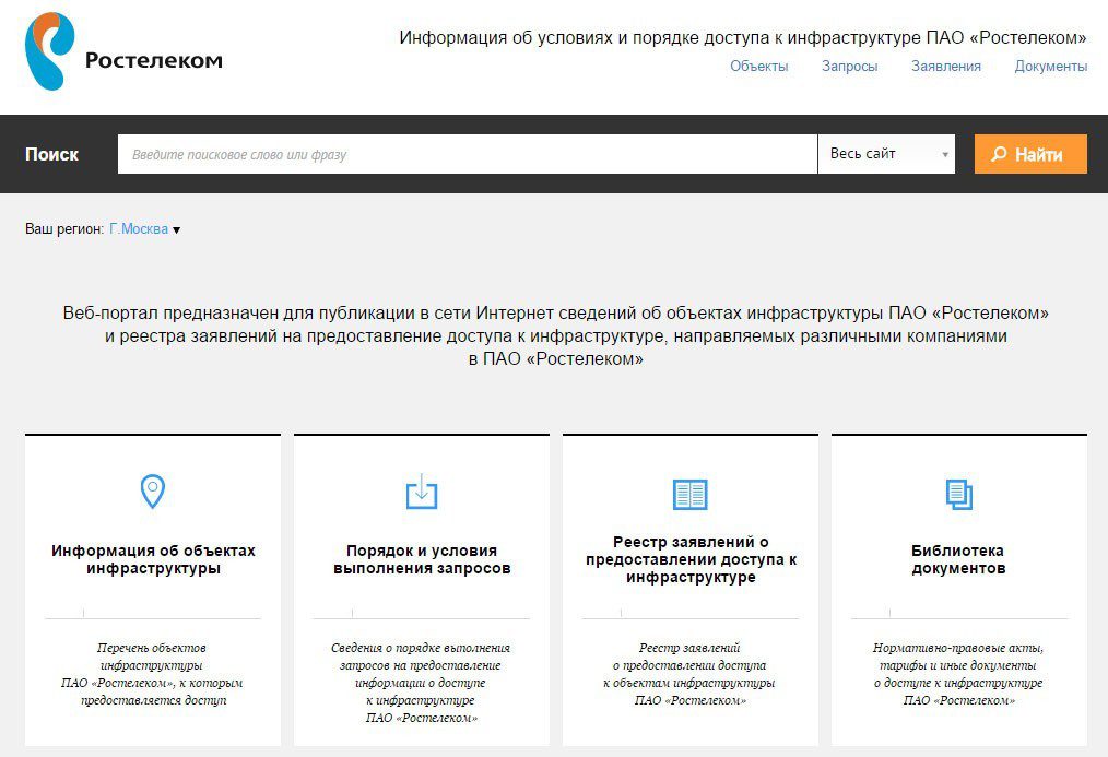 Сайт предназначен для публикации в Интернете сведений об объектах инфраструктуры ПАО «Ростелеком» и реестра заявлений на предоставление доступа к инфраструктуре, направляемых различными компаниями в «Ростелеком».