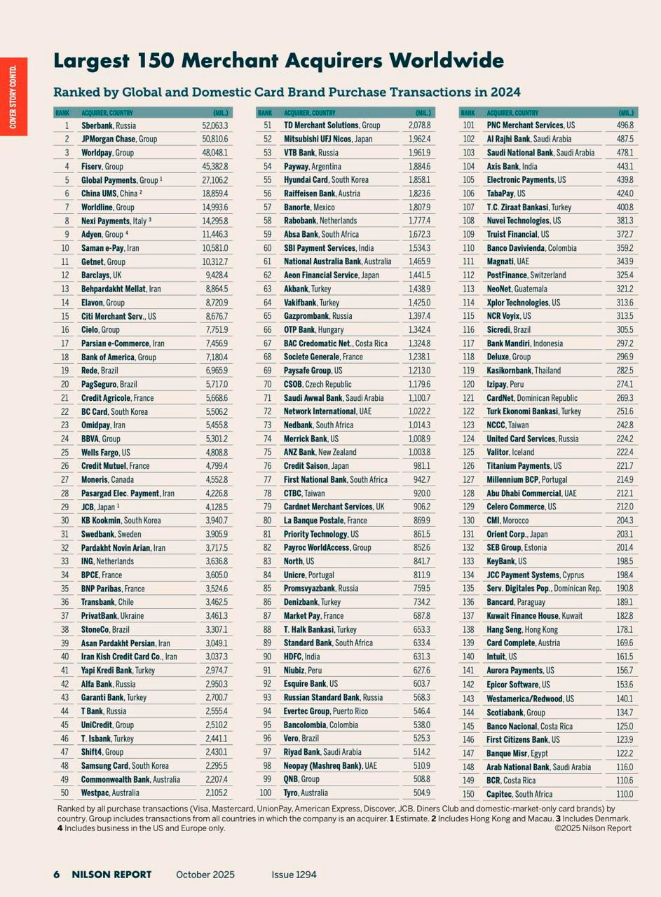По итогам 2023 года Сбербанк находился на втором месте в рейтинге Nilson, первое занимал JPMorgan Chase, на третьей строчке была глобальная платёжная система Worldpay.