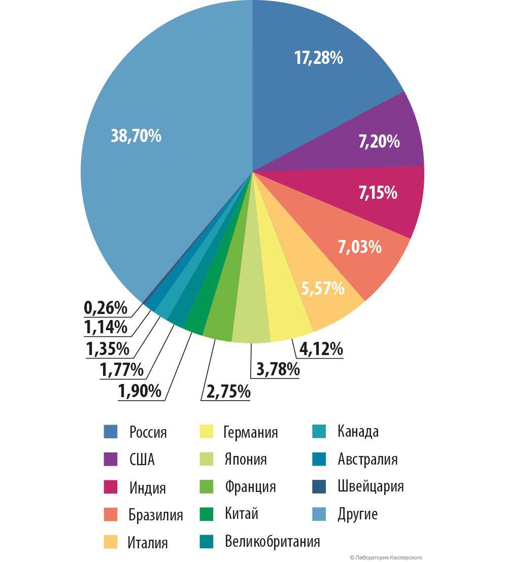 В рейтинге наиболее часто атакуемых фишерами стран лидирует Россия (17,28%) – за год ее доля увеличилась на 6 пунктов. При этом лидер прошлого года, США (7,2%), потерял почти 24 пункта и сместился на второе место. В 42,6% таких атак мошенники прикрывались именами интернет-порталов, что отличается от ситуации в 2013-м году, когда чаще всего использовались названия социальных сетей.
