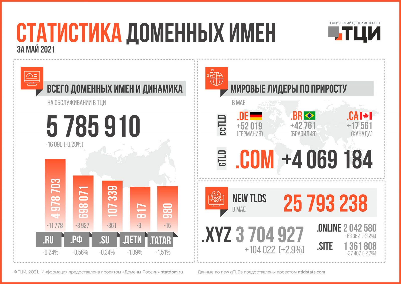 По итогам мая 2021 года количество доменных имён на обслуживании в «Техническом центре Интернет» составило 5 785 910, что на 0,28% меньше, чем в апреле 2021. В домене .ru в конце мая было 4 978 703 доменных имени (-11 778), в домене .рф — 698 071 (-3927). В домене .su — 107 339 доменных имён (-361), в домене .tatar — 980 (-15), в домене .дети — 817 (-9).