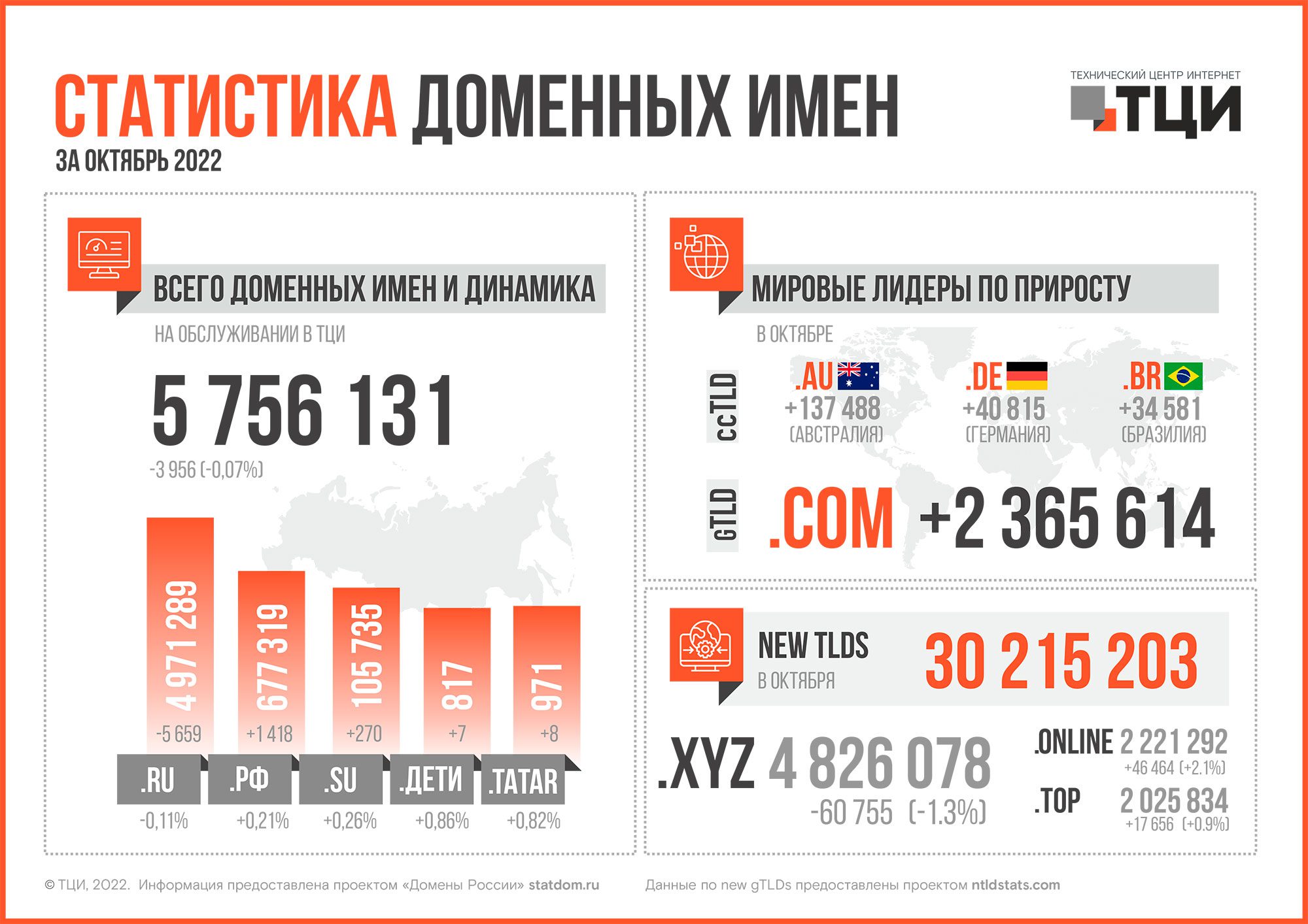 По итогам октября 2022 года количество доменных имён на обслуживании в «Техническом центре Интернет» составило 5 756 131, что на 0,07% меньше, чем в сентябре 2022. В домене .ru в конце октября было 4 971 289 доменных имён (-5659), в домене .рф — 677 319 (+1418). В домене .su — 105 735 доменных имён (+270), в домене .tatar — 971 (+8), в домене .дети — 817 (+7).