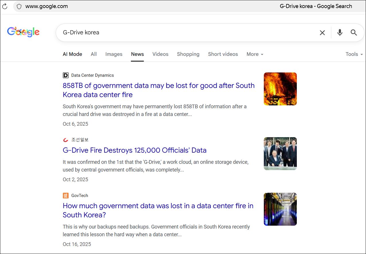 Сентябрьский пожар в дата-центре, обеспечивавшем работу корейского электронного правительства (которое там называется G-Drive), странным образом отсутствует в поисковой выдаче сервиса Google News, настроенного на американский контент, см. скриншот. Самая свежая запись на первой странице – от 16 октября.