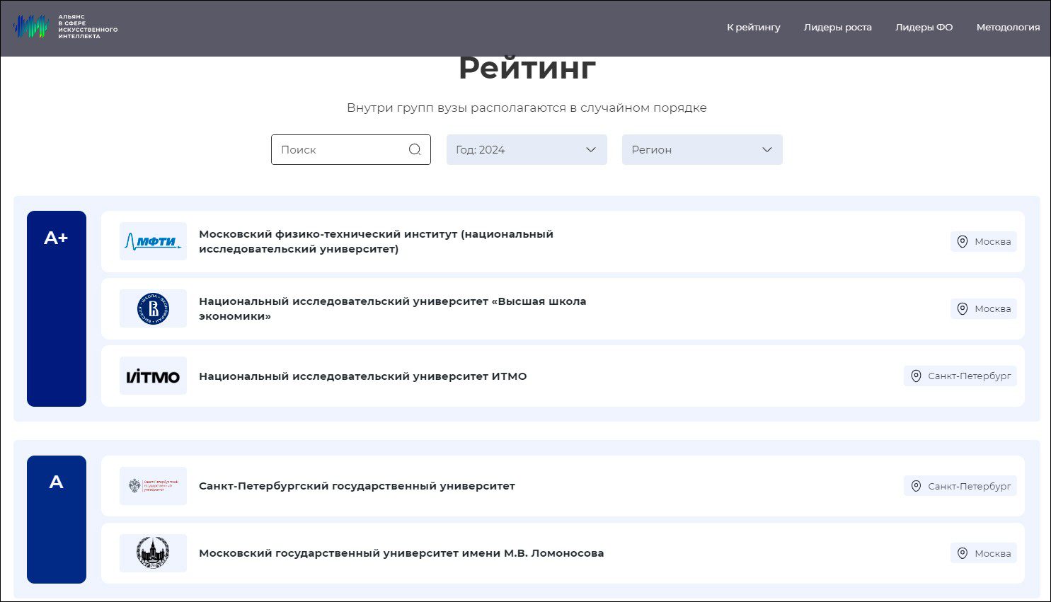 В первую пятёрку вузов-лидеров (категории А+ и А) вошли МФТИ, НИУ ИТМО, НИУ ВШЭ, МГУ имени М.В. Ломоносова и СПБГУ.