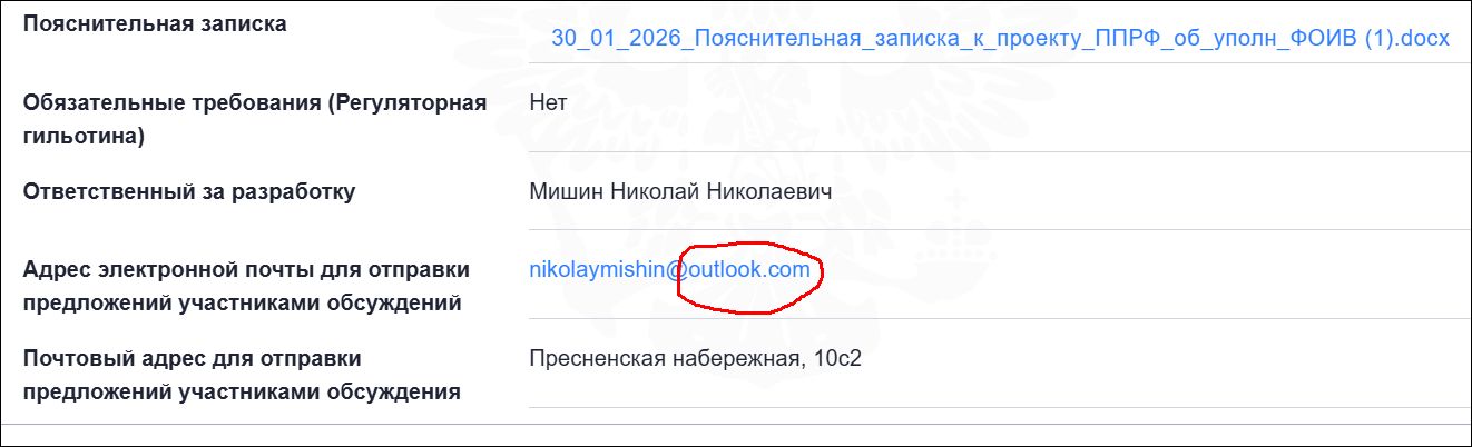 Заметим попутно, что указанный на regulation.gov.ru почтовый адрес «для отправки предложений участниками обсуждений» проекта постановления зарегистрирован на принадлежащем Microsoft почтовом сервисе outlook.com.