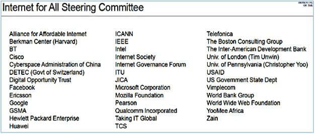 Руководящий комитет проекта «Интернет для всех» (Internet for All Steering committee) в рамках инициативы «Будущее Интернета» (Global Challenge Initiative on Future of the Internet) Всемирного экономического форума (ВЭФ) на 2016 год запланировал около двадцати мероприятий высокого уровня.