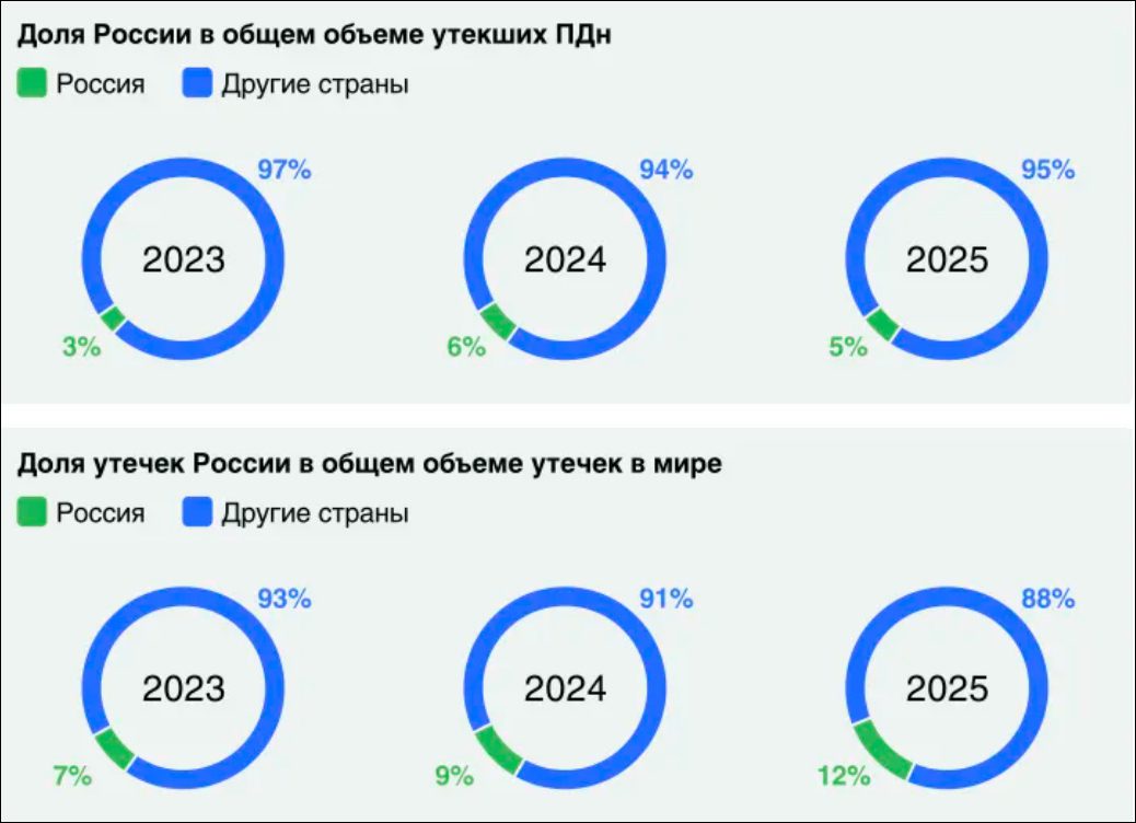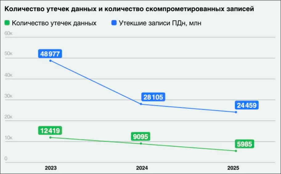 В то же время в России количество записей на одну утечку стабильно растет несколько лет: в 2025 году утекало в среднем 3,27 миллиона записей за один инцидент, что на 25,8% больше, чем в 2024 году и на 44% больше, чем в 2023 году.
