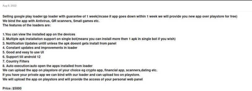 В даркнете злоумышленники покупают и продают вредоносные приложения для Google Play, а также обновления для них, и рекламируют свои разработки. Чтобы загрузить зловред в стор, они покупают аккаунт разработчика в Google Play и загрузчик вредоносного кода. Аккаунты предлагают по цене от 60 до 200 долларов. Стоимость вредоносных загрузчиков варьируется от 2 до 20 тысяч долларов в зависимости от сложности, новизны и уникальности кода, а также от дополнительной функциональности.