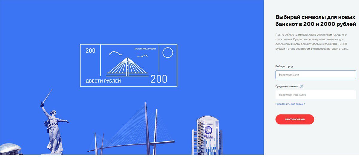 Банк России запустил сайт «Твоя-Россия.рф», на котором можно выбрать символы для новых банкнот номиналом 200 и 2000 рублей.